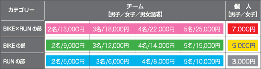 BIKE×RUNチャレンジin成田への参加料金は下記の通りです。選択するコースや参加人数に応じて料金が変わりますのでご注意ください。
